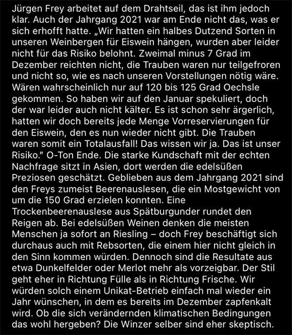 Was auch an der besser hervorgebrachten Säure liegen mag, die den Weinen guten Schliff gibt. Uns hat es, neben den Eisweinen, besonders die Spätburgunder Trockenbeerenauslese angetan.