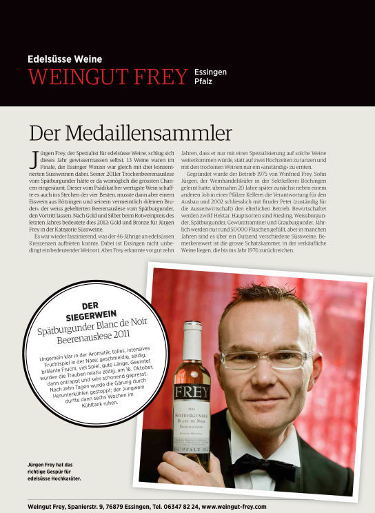 Jürgen Frey, sonst Seriensieger bei Edelsüß, wird es verkraften, dass es diesmal «nur» zu Bronze reichte. Honig und feine Würze zum Auftakt; cremig und vielschichtig im Geschmack, sehr ausgewogen und ausdauernd, delikate Süsse.